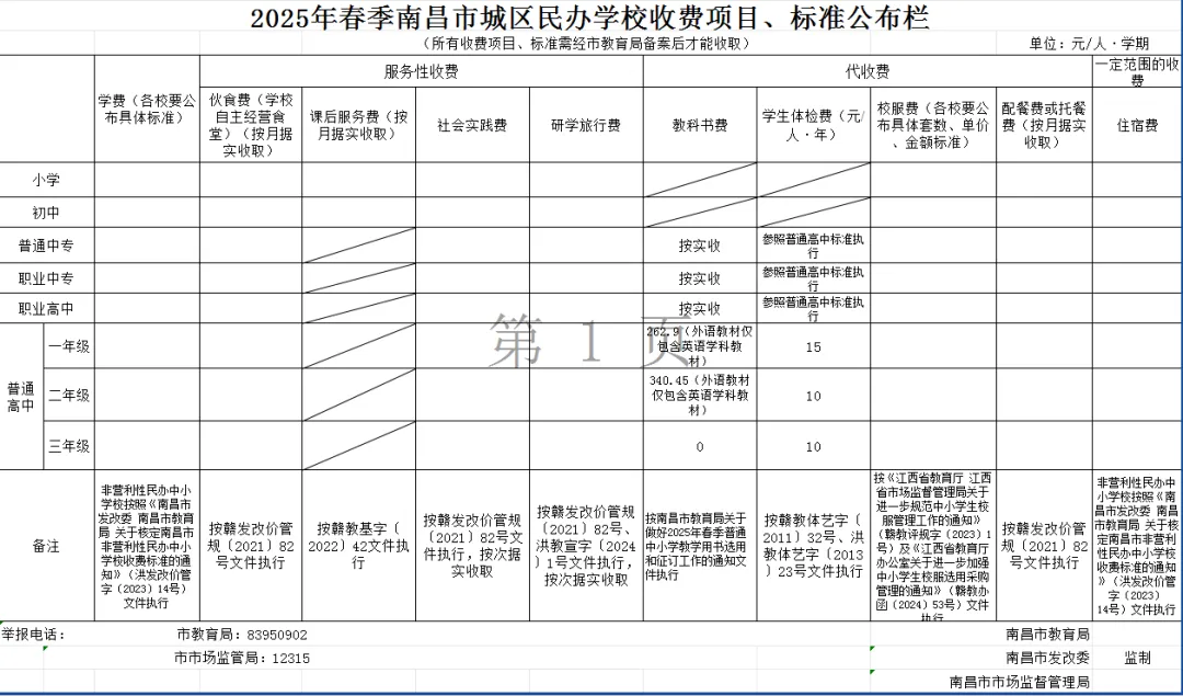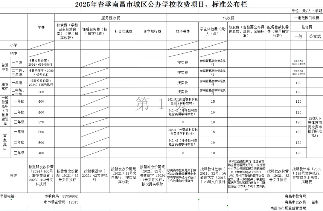 (1)教科书费:教科书的选用和征订严格按照《南昌市教育局关于做好 2025年春季普通中小学教学用书选用和征订工作的 通知》执行。城乡义务教育学校实行统一的“ 两免一补 ”政策, 免费向学生发放国家课程和地方课程教科书。高中阶段教科书费含与教科书配套数字音像材料严格按照省发展和改革委员会、省新闻出版局核定的价格据实收取。