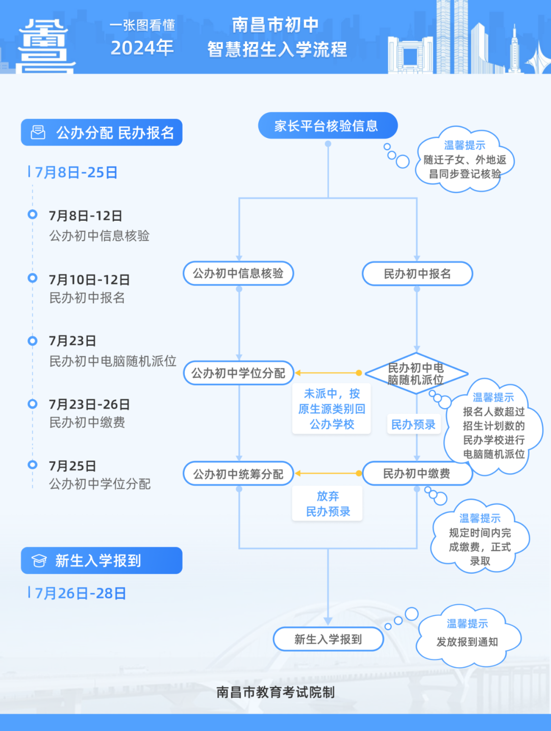 “南昌市义务教育智慧入学数字平台”2024年初中入学信息核验时间为:7月8日-12日(其中民办初中报名时间为7月10日-12日);小学入学信息核验时间为:7月15日-19日(其中民办小学报名时间为:7月17日-19日)。