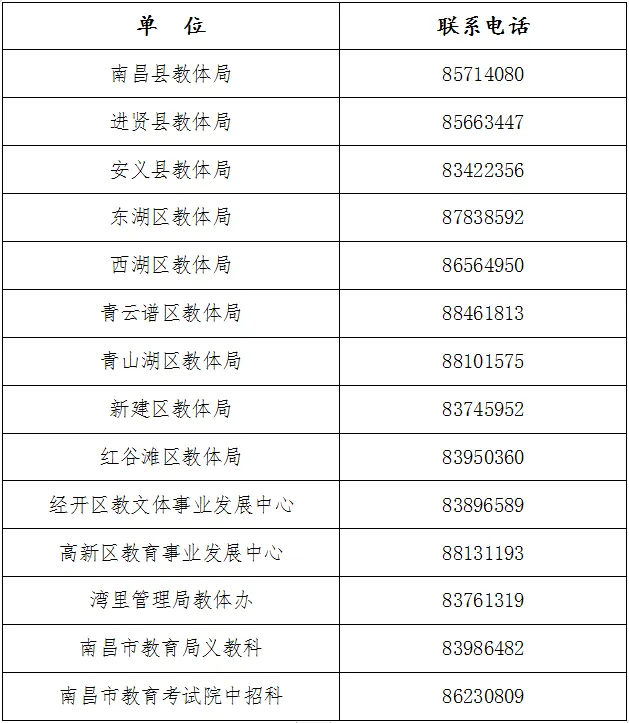 各县区义务教育招生入学咨询电话一览表