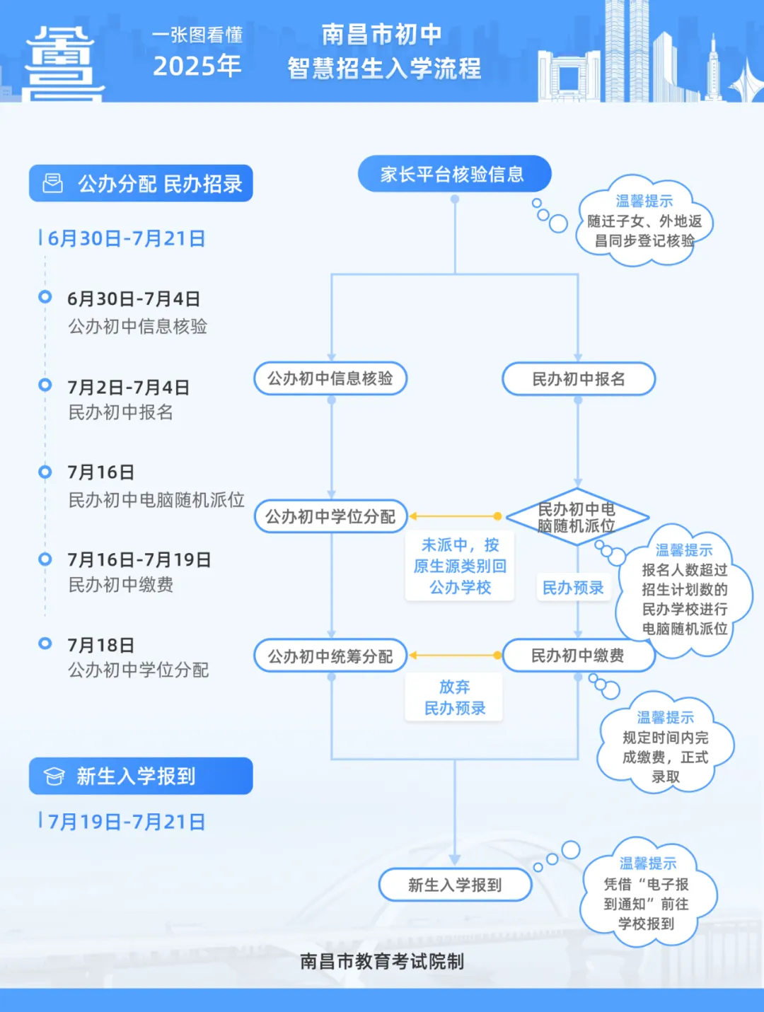 “南昌市义务教育智慧入学数字平台”2025年小升初于6月30日-7月4日进行信息采集,幼升小于7月7日-7月11日进行信息采集。(其中,民办初中报名时间为:7月2日-4日,民办小学报名时间为:7月9日-11日)