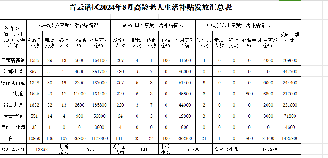 平博888 2024年8月高龄老人生活补贴发放汇总表