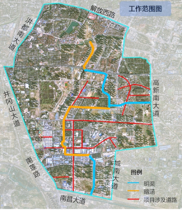 项目实施范围为:洪都南大道、井冈山大道,南莲路,南昌大道、城南大道,高新南大道、解放西路合区域。项目概算总投资为27383.71万元,其中:工程费用23514.35万元。主要建设内容及规模:本项目为结合辖区内玉带河南支、南北连通渠及周边市政道路,针对已完成摸排的16条市政道路排水管网结构性、功能性缺陷深度成果,主要建设内容为新建市政排水管、改造错混接市政排水管、市政排水管开挖修复、市政排水管非开挖修复、检查井修复、井盖更换、防坠网更换、南北连通渠明渠清淤、暗渠清淤、淤泥处置对南北连通渠沿线排口黑臭水体改造、市政道路路面恢复、南北连通渠改闸门智慧化改造以及其他附属设施。